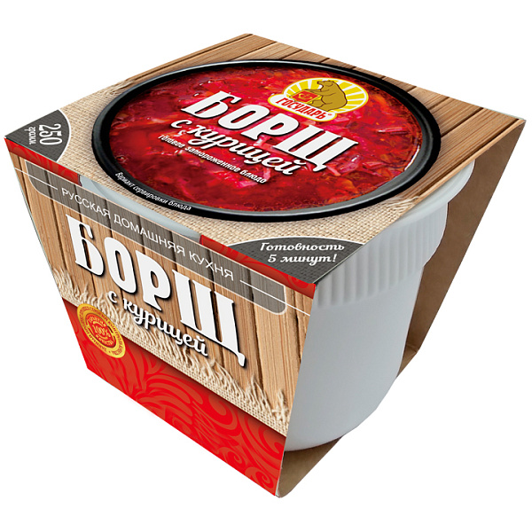 Состав Вода питьевая, свекла столовая, картофель, курица, лук репчатый, томатная паста, капуста белокочанная, морковь столовая, масло подсолнечное рафинированное, соль, регулятор кислотности — уксусная кислота, паприка, петрушка, укроп, лавровый лист, агент антслеживающий Е536. Продукт может содержать следы сои, глютена, молока, яйца, сельдерея, рыбы и продуктов их переработки
