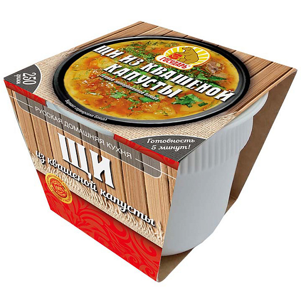 Состав Вода питьевая, капуста квашеная (капуста белокочанная, морковь, соль), картофель, курица, морковь, лук репчатый, масло подсолнечное рафинированное, соль, чеснок, петрушка, лавровый лист, агент антислеживающий Е536. Продукт может содержать следы сои, глютена, молока, яйца, сельдерея, рыбы и продуктов их переработки