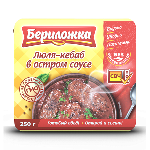 Люля-кебаб в остром соусе “Бериложка” – мясорастительные консервы, стерилизованные. Перед употреблением рекомендуется разогреть. Продукт не содержит ГМО, консервантов.